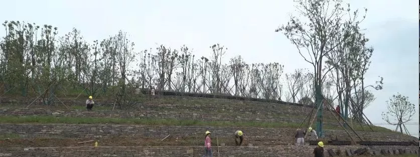 西入口建設現(xiàn)場的兩側山坡上層層疊疊十多道“梯田”十分引人注目,靠近入口的部分已經(jīng)種上了烏桕等喬木。這些“梯田”式的臺階叫跌級花谷,原狀是由兩座崗地所夾形成的谷地,依托原地形打造出了跌級花谷擋墻。此處以鳳冠霞帔為設計理念,由“從荊山飛來一只鳳凰,棲息于園博園之中”的故事引申而來,仿造鳳凰的尾羽形態(tài)形成平面布局,呈流線型蜿蜒入內(nèi)。待季節(jié)適宜時,擋墻內(nèi)將種上紅、橙、粉、黃等多色彩的月季花,再以桂花、櫻花等花樹點綴,屆時兩側萬花盛開、五彩繽紛,營造出熱情好客的視覺效果。