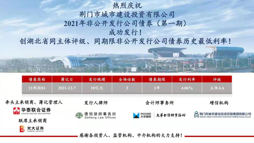 該筆債券牽頭主承銷商為華泰聯(lián)合證券有限責(zé)任公司,聯(lián)席主承銷商為光大證券股份有限公司,發(fā)行規(guī)模10億元,票面利率4.06%,期限3年,全場認(rèn)購倍數(shù)3倍。此次發(fā)行創(chuàng)湖北省同主體評級、同期限非公開發(fā)行公司債券歷史最低利率。(文:王金華)