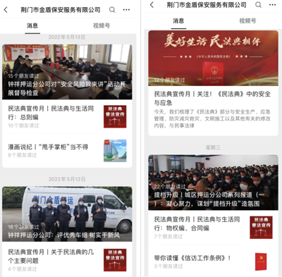 三是積極開展“指尖普法”。依托公司微信公眾號(hào)發(fā)布“民法典宣傳月”合集圖文,精心挑選轉(zhuǎn)載與工作、生活緊密相關(guān)的案例及法條解讀內(nèi)容,要求公司全員認(rèn)真閱讀學(xué)習(xí)。安保分公司充分利用微信公眾號(hào)和工作群,廣泛轉(zhuǎn)發(fā)優(yōu)質(zhì)普法推文,在促進(jìn)自學(xué)的同時(shí),積極向身邊的朋友及家人宣傳民法典的編寫意義、亮點(diǎn)及案例解讀等,讓每一位員工既當(dāng)“學(xué)法員”,也當(dāng)“普法員”。