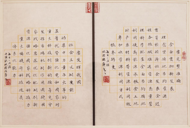 ――荊門城控集團(tuán)黨委委員、紀(jì)委書記、監(jiān)察專員鐘立峰為本次活動書寫的書法作品“盛世中華”“恰同學(xué)少年”。
