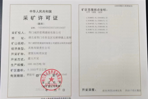 荊門城控窯灣建材有限公司成功取得建筑石料用灰?guī)r《采礦許可證》
