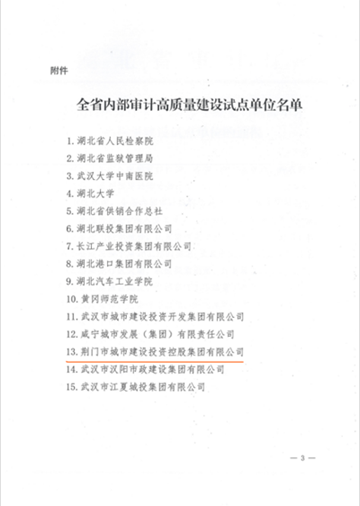 近期,湖北省審計(jì)廳發(fā)布《湖北省審計(jì)廳關(guān)于2022年度全省內(nèi)部審計(jì)高質(zhì)量建設(shè)試點(diǎn)單位的通報(bào)》,荊門城控集團(tuán)被成功評(píng)為湖北省內(nèi)部審計(jì)高質(zhì)量建設(shè)試點(diǎn)單位。