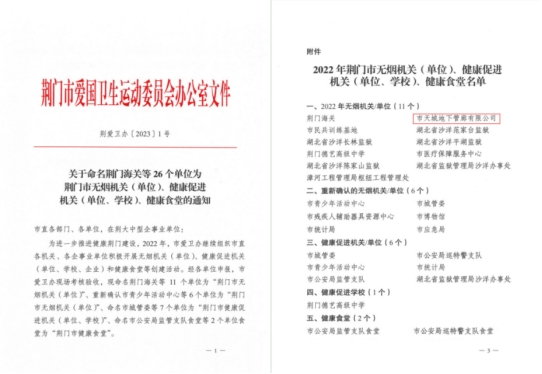 近日,荊門市愛衛(wèi)辦授予天城地下管廊有限公司“2022年無煙單位”榮譽(yù)稱號。