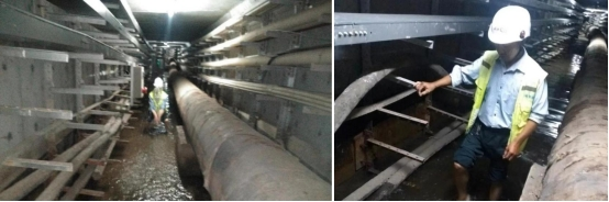 在泉口綜合管廊第六分區(qū),巡查人員發(fā)現(xiàn)排水泵故障,積水不斷上漲,公司立即安排人員進(jìn)行設(shè)備搶修,抽排積水。在仙楊路綜合管廊下穿河道處,因避讓河道,此處管廊呈“凹”字型,管廊內(nèi)部積水嚴(yán)重,公司組織人員架設(shè)臨時(shí)排水泵進(jìn)行抽排,經(jīng)過(guò)5小時(shí)緊急搶險(xiǎn),消除了安全隱患。