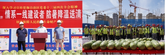 近日,荊門城控集團黨委委員、紀委書記、監(jiān)察專員鐘立峰帶隊深入銀川江山閱項目施工現(xiàn)場,開展黨員干部下基層察民情解民憂暖民心實踐活動暨“情系一線建設者,防暑降溫送清涼”慰問,為奮戰(zhàn)在江山閱項目上的一線員工發(fā)放礦泉水、西瓜等防暑降溫物資。俊豐綠建集團、銀川分公司負責人等參加。