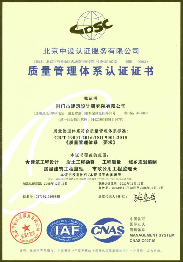 近日,北京中設(shè)認(rèn)證服務(wù)有限公司對(duì)市建筑設(shè)計(jì)研究院有限公司質(zhì)量管理體系進(jìn)行審核認(rèn)證,公司順利通過認(rèn)證并獲得證書。此次認(rèn)證是公司自2005年首次通過后,連續(xù)第18年再認(rèn)證成功。
