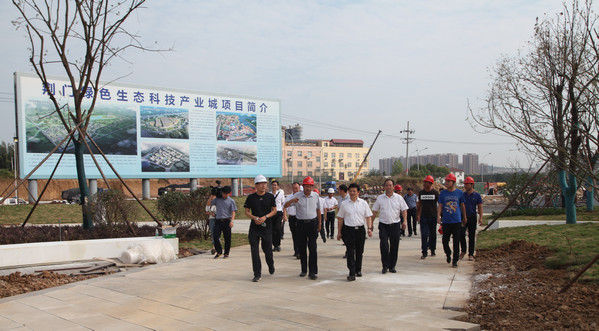 圖為市長張依濤(前排右二)調(diào)研荊門綠色生態(tài)科技產(chǎn)業(yè)城國際會(huì)展中心建設(shè)項(xiàng)目現(xiàn)場