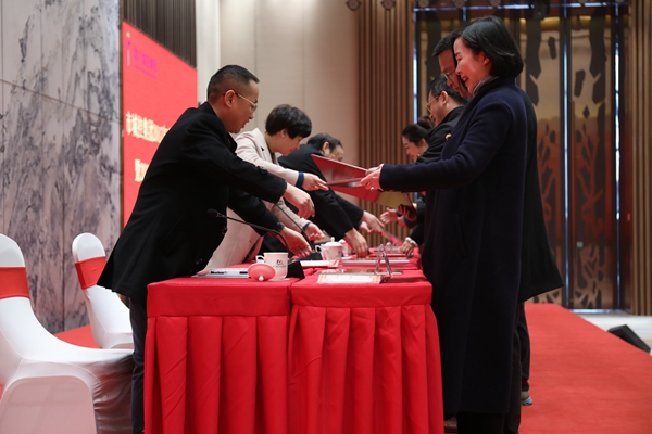 圖為集團(tuán)領(lǐng)導(dǎo)班子為先進(jìn)集體頒發(fā)獎(jiǎng)牌