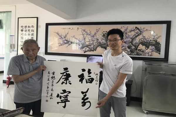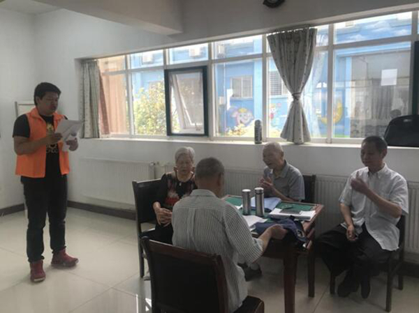 志愿者與老人切磋歌藝,老人一首,志愿者一首,其樂融融