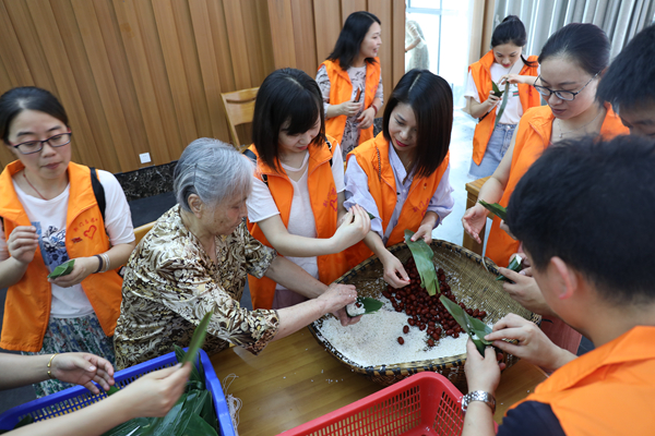 志愿者與老人一起包粽子,向老人請教包粽子方法,中華傳統(tǒng)文化得到傳承