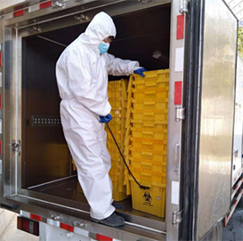 李奎在搬運(yùn)醫(yī)療廢物周轉(zhuǎn)箱