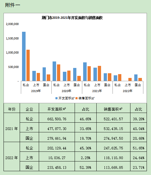 經(jīng)調(diào)查,荊門房地產(chǎn)市場近幾年整體呈現(xiàn)萎縮狀態(tài)(城區(qū)尤為突出),市場持續(xù)低迷、不穩(wěn)定性增加(今年上半年荊門城區(qū)僅成交土地1宗)。幾家大型房地產(chǎn)企業(yè)陸續(xù)因多元化、盲目擴(kuò)張、高杠桿拿地、疫情、無限制調(diào)控、市場下行、銀行三條紅線管控等原因出現(xiàn)資金斷裂,導(dǎo)致項(xiàng)目停工停產(chǎn)。東寶、掇刀原民營企業(yè)開發(fā)的樓盤基本出現(xiàn)爛尾。從今年1-5月房地產(chǎn)情況看,東寶、掇刀、漳河新區(qū)同比分別負(fù)增長70.2%、49%、1.2%,出現(xiàn)斷崖式下滑。2019年-2021年間,荊門城區(qū)整體開發(fā)面積從258萬方下降至142萬方,下降幅度達(dá)44.8%。從各類型企業(yè)來看,降幅最大的是民營私企,下降幅度達(dá)61.8%。截至2021年底,荊門城區(qū)已批準(zhǔn)預(yù)售尚未網(wǎng)簽的商品住房 16293套,面積189.6萬方。2022年,整體形勢依然不容樂觀,僅有央企、市屬國企、上市民企(洋豐集團(tuán))占主導(dǎo)地位。上半年僅完成開發(fā)面積44萬方,其中國有企業(yè)表現(xiàn)穩(wěn)定,完成開發(fā)量已接近去年全年水平。同期,房地產(chǎn)銷售面積同樣呈現(xiàn)持續(xù)下滑態(tài)勢,其中民營私企下滑幅度明顯,從110萬方下降至52萬方,國有企業(yè)銷售面積相對平穩(wěn)(附表見后)。