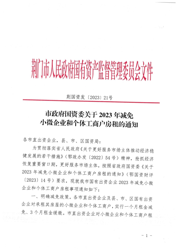 市政府國資委關(guān)于2023年減免小微企業(yè)和個體工商戶房租的通知