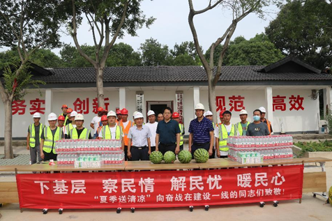 程雄一行深入項目現(xiàn)場,了解項目建設狀況,詳細了解基層群眾工作,并為奮戰(zhàn)在項目一線人員送去礦泉水、西瓜、防暑降溫藥品等慰問物質(zhì)。程雄與一線員工交心談心,仔細了解他們的生活和工作情況,代表集團對他們頂高溫、戰(zhàn)酷暑,全力完成項目建設任務的敬業(yè)精神表示了贊揚與感謝,叮囑他們在堅守崗位的同時,注意防暑降溫,將安全生產(chǎn)落實到實際行動中,并要求大家科學合理地安排好作息時間,建立錯時工作制,盡可能避開高溫時段,防止高溫中署,確保高溫條件下生產(chǎn)安全和身體健康,以更好的狀態(tài)投入到工作中。