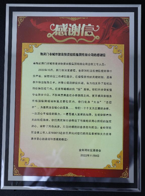 一面錦旗,是一種信任和肯定;一封感謝信,是一份敬意和動力。在疫情防控這場大考中,荊門城控集團黨委用責任和擔當貢獻國企力量,志愿者們用堅守和奉獻踐行了城控人的初心使命,為社區(qū)筑起一道攜手抗疫的愛心橋梁。(文:李曉威 圖:周健)