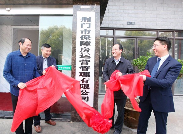 圖為杜佐鵬、豐金亮、李俊峰、楊清華共同為荊門市保障房運營管理有限公司揭牌