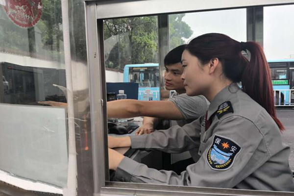 圖為停車(chē)場(chǎng)公司管理人員現(xiàn)場(chǎng)指導(dǎo)收費(fèi)安保員熟悉系統(tǒng)
