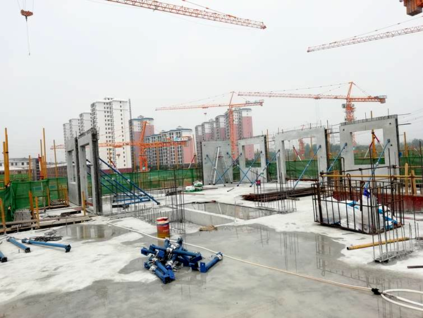 第一批裝配式建筑預(yù)制構(gòu)件主要包括外墻、樓梯、陽臺(tái)、隔板等,總計(jì)約8900立方米。經(jīng)現(xiàn)場實(shí)測,一個(gè)小時(shí)可完成3片外墻構(gòu)件吊裝,每片外墻構(gòu)件5個(gè)平方米,1個(gè)立方米,約2噸半左右。4-5天可以完成一層裝配式建筑構(gòu)件安裝和現(xiàn)澆工作。采取裝配式建筑較傳統(tǒng)施工的工期將提升20-30%。