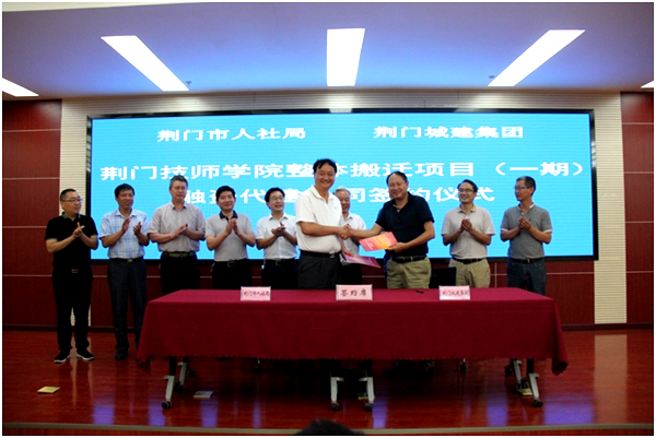 8月28日下午,荊門技師學院整體搬遷項目(一期)融資代建合同簽約儀式在市人社局15樓會議室舉行。市城控集團總經理、荊門城建集團董事長豐金亮與市人社局黨組書記、局長,市公務員局局長李本全簽署了項目融資代建合同。荊門技師學院院長許松、黨委書記陳克新,城建集團副總經理葉東、周年昌,荊門市鑫建城鎮(zhèn)化建設投資有限公司副總經理周洪兵等參加并見證了簽約儀式。